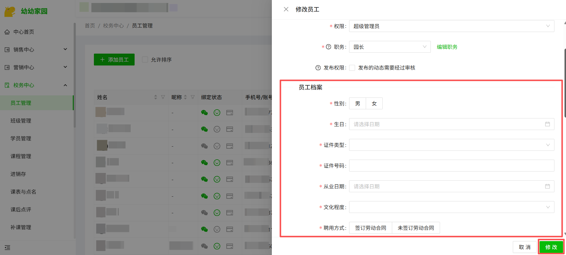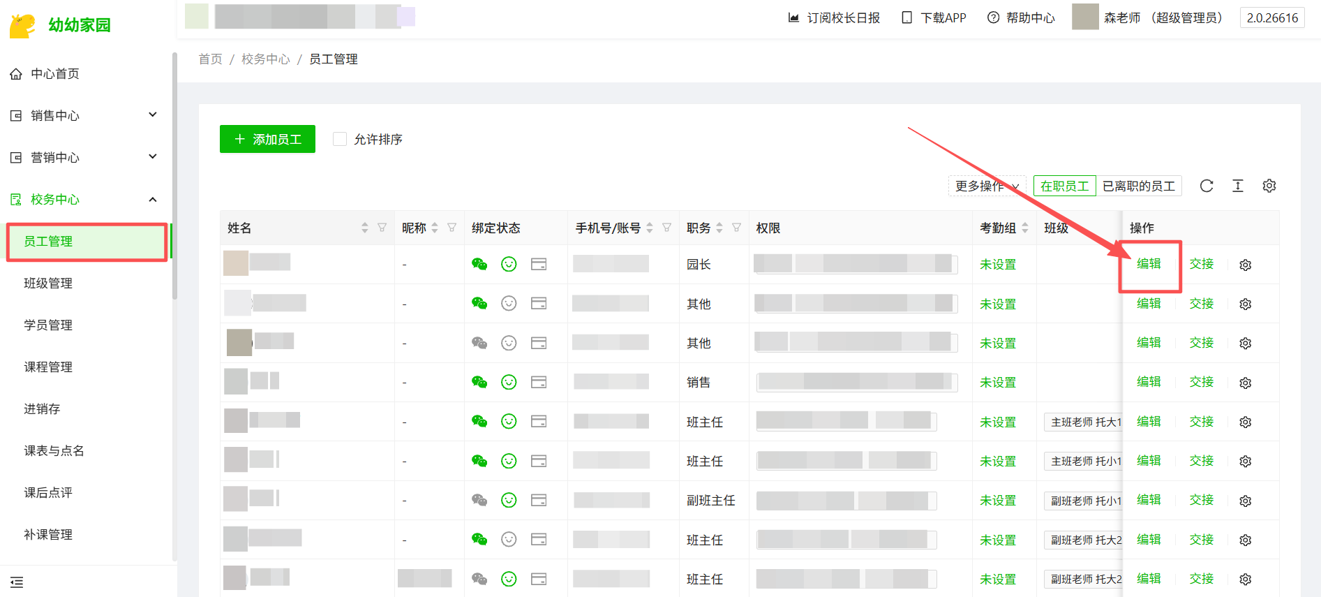 1、进入电脑端管理后台“校务中心-员工管理”,点击员工信息后方“编辑”