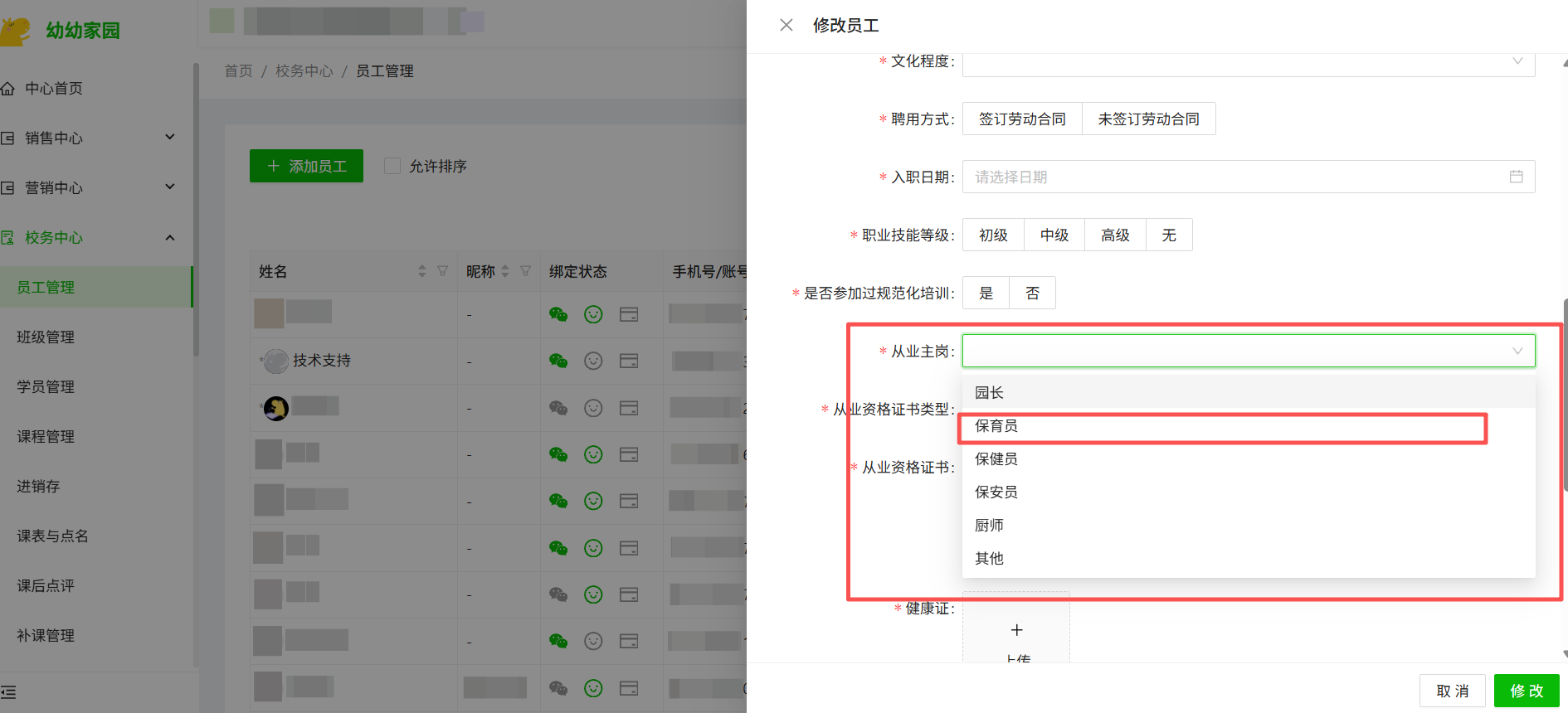 如是需要分配进班级的主班、副班、保育员等教师,需要将从业主岗一栏选为“保育员”,否则无法分配班级。