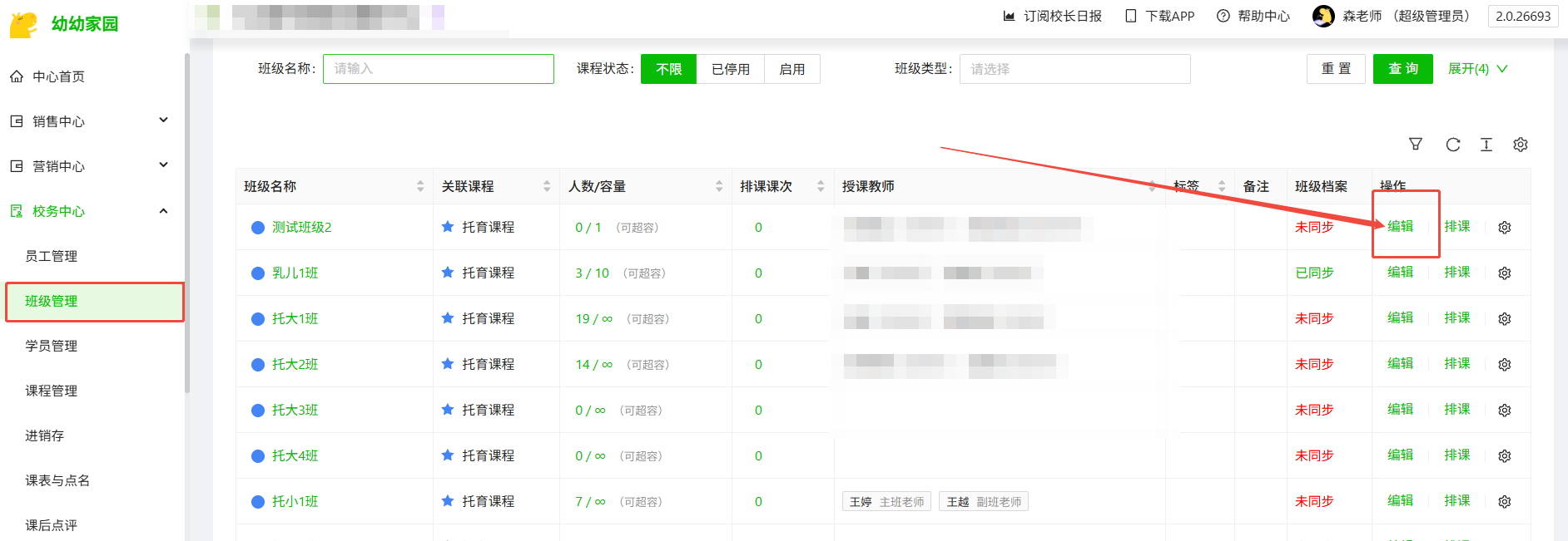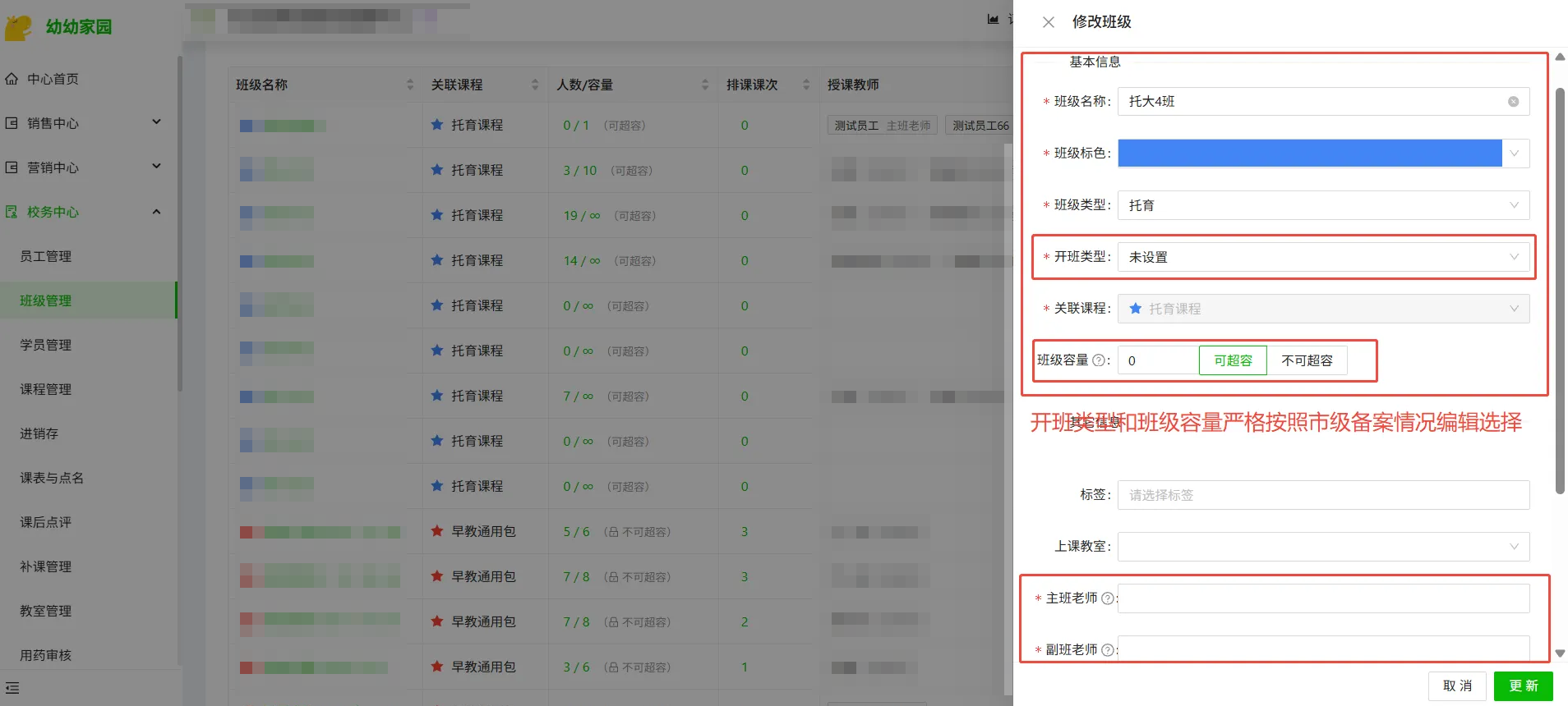 进入“校务中心-班级管理”编辑班级信息,补充班级的班级类型、开班类型、班级容量等信息,