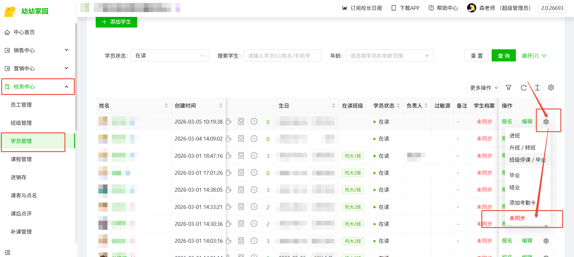 进入电脑端管理后台“校务中心-学员管理”,点击学员信息后方“⚙-未同步”