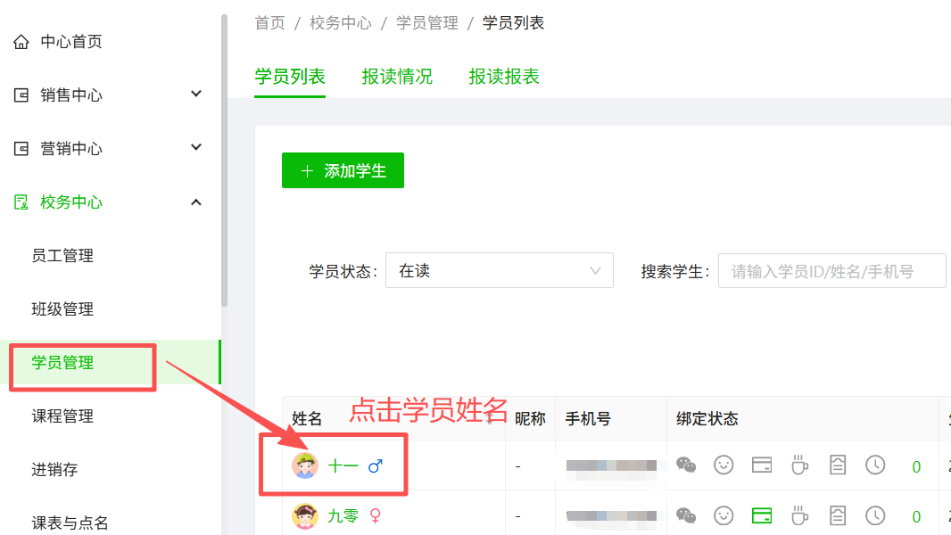 1、进入【校务中心-学员管理】,点击需要冲正的学员姓名后进入该名学员的报读详情页