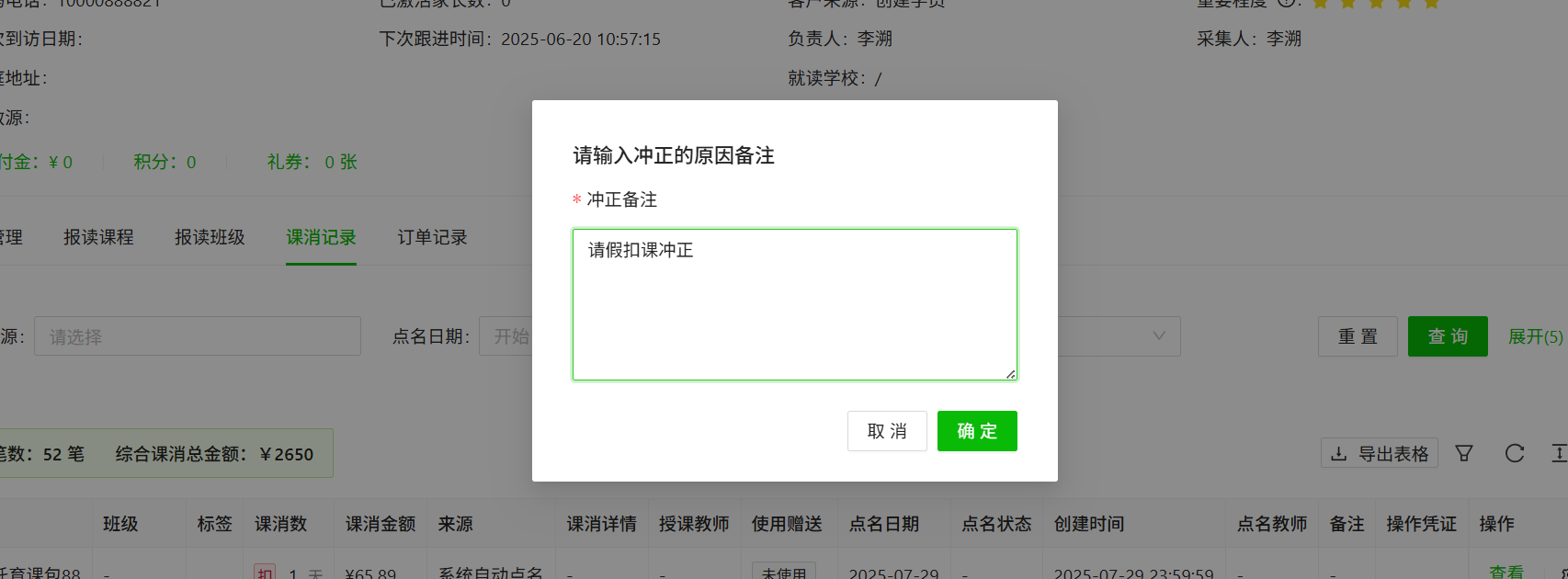 2、查看该学员“课消记录”,点击需要冲正的课消记录后方“⚙”,点击【冲正】