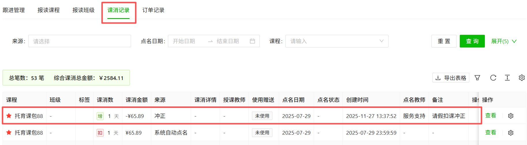 课消记录冲正后,可以在课消记录中查询到学员的冲正记录,系统对学员课包自动延期,订单合同到期时间不发生变化。