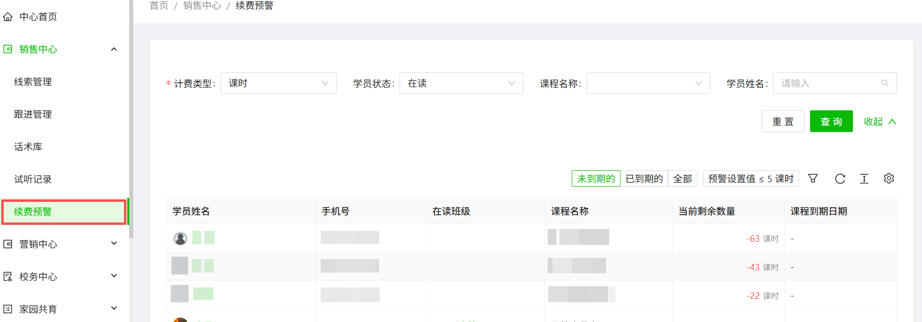 课包已经到期或即将到期的学员可进入续费预警模块进行查看。