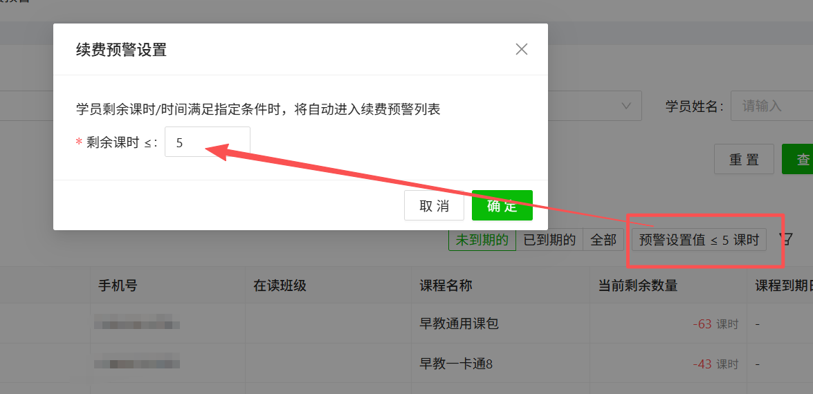 可根据园所的具体需求设置续费预警值,课包剩余数小于等于设定值时的学员会进入续费预警池。