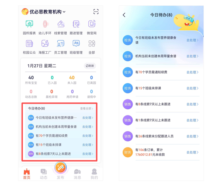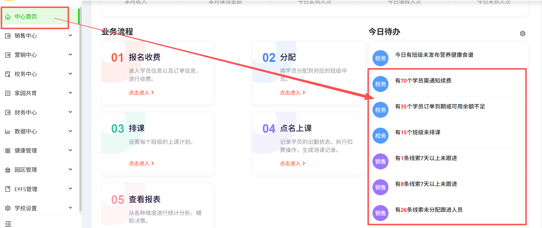 电脑端管理后台的中心首页和教师端首页的“今日待办”模块也会将需要通知续费和跟进的线索纳入待办项 。